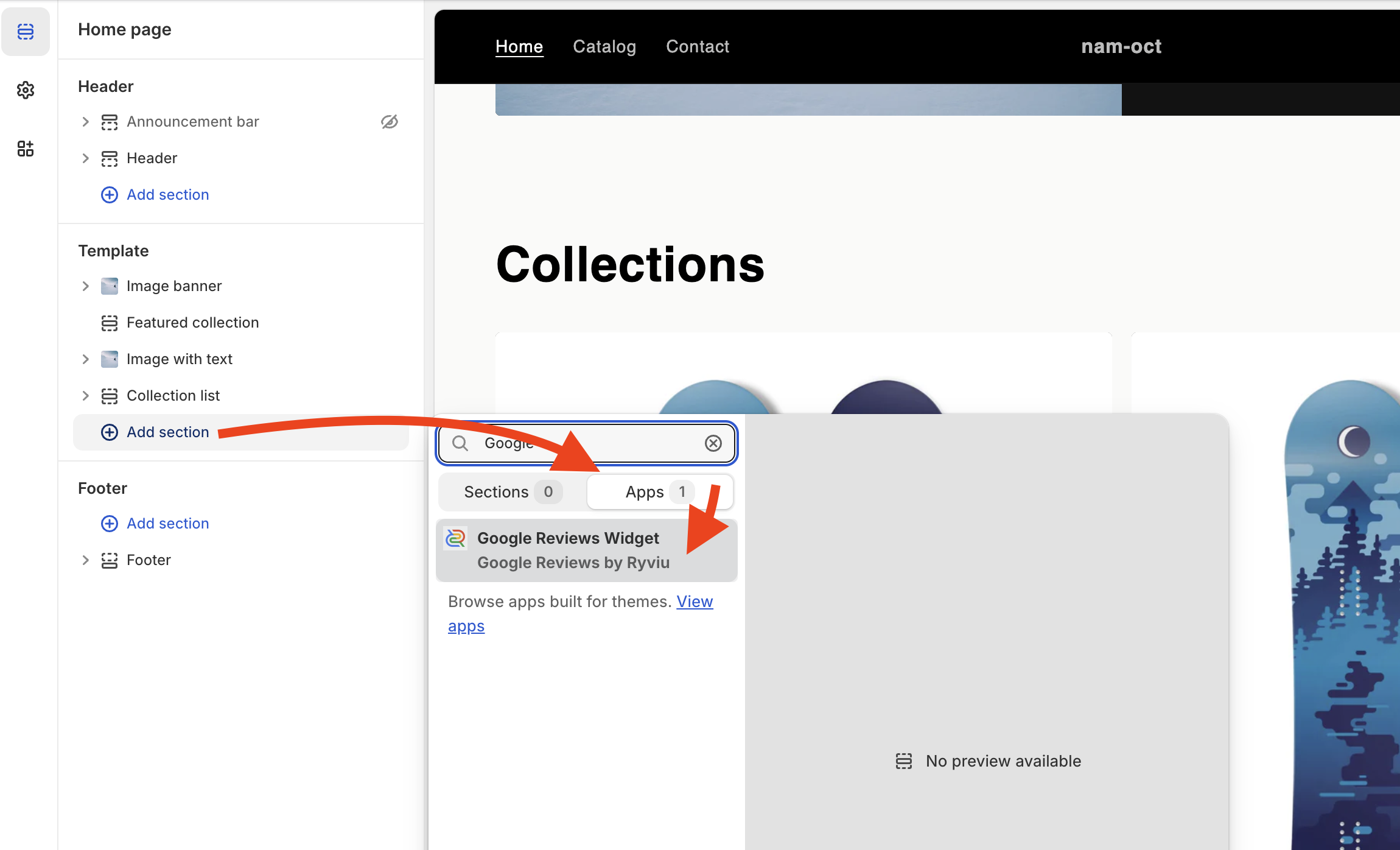 Click +Add section on the left, open Apps, select Google Reviews Widget by Ryviu