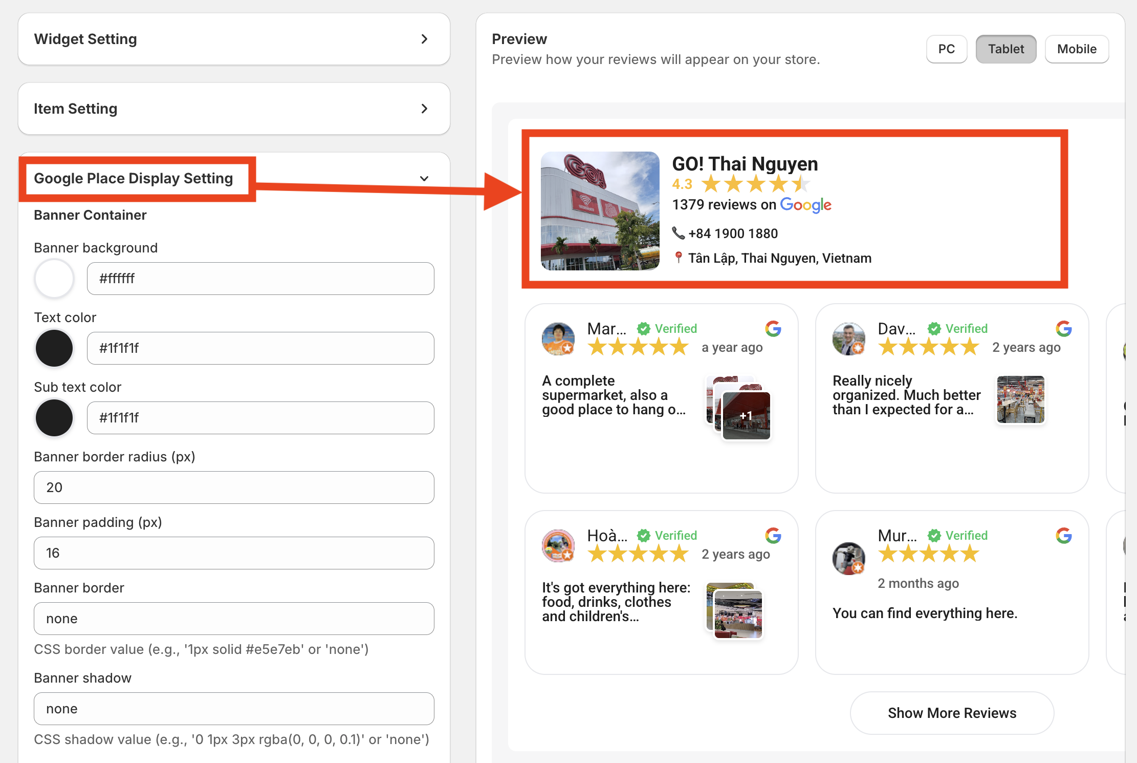 Review Text: show/hide review text, set text color, set text font size, set text line height. Set max text length, limit text line length, and show/hide ‘Show more‘ button.