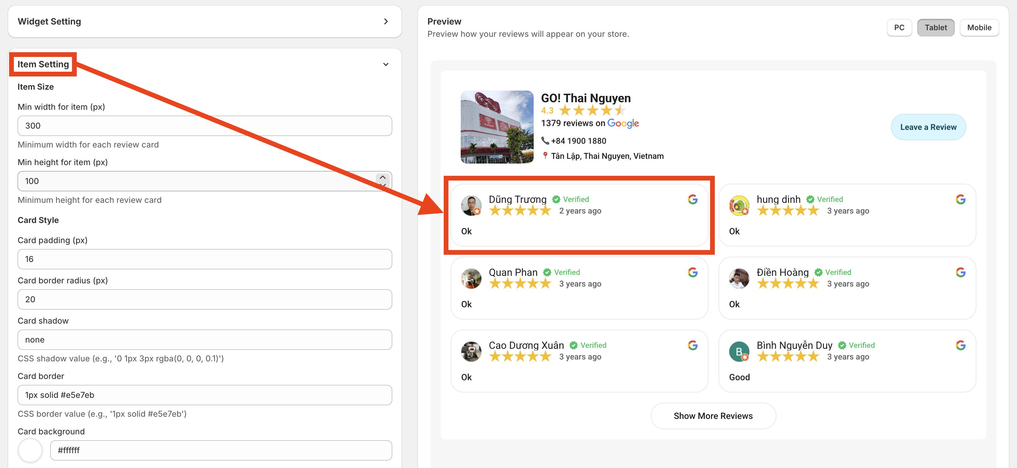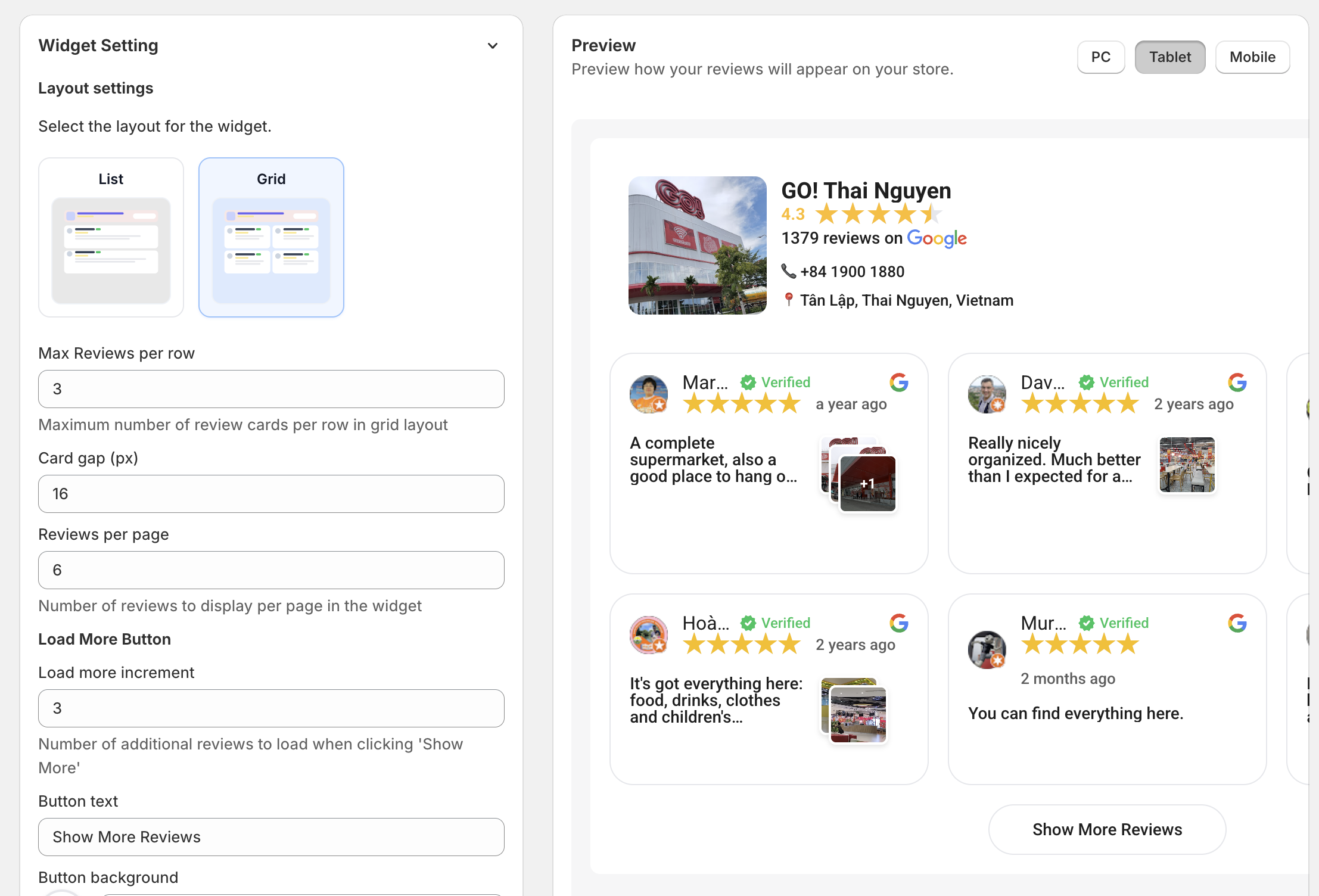 Layout settings: select the widget layout, the maximum reviews per row on PC and Tablet, the gap between review cards, and the number of reviews per page.